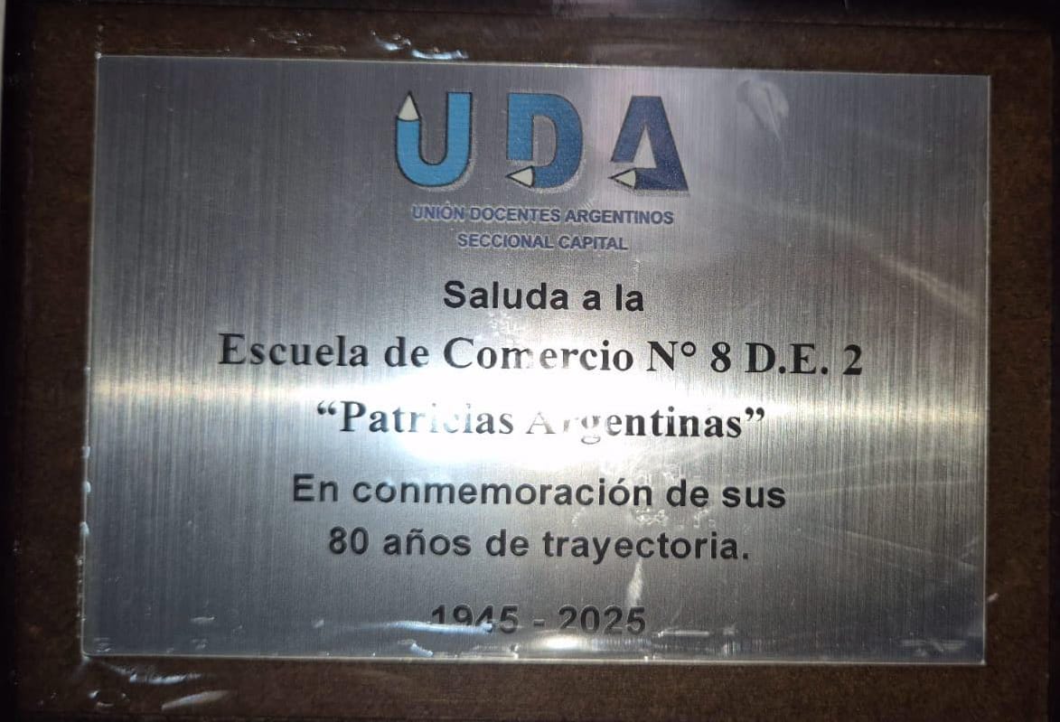 En representación de la organización, los dirigentes de UDA Capital, junto a las delegadas de la escuela, realizaron la entrega de una placa conmemorativa en reconocimiento a la trayectoria, el compromiso educativo y el valioso aporte de la institución a la formación de generaciones de estudiantes.